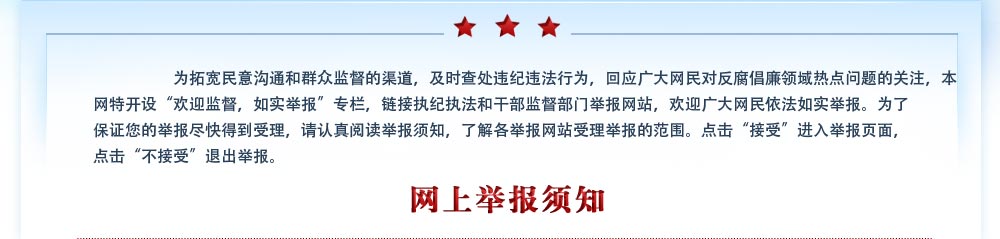 1 中央紀(jì)委、監(jiān)察部舉報(bào)網(wǎng)站受理:針對(duì)黨組織、黨員和監(jiān)察對(duì)象違反黨紀(jì)政紀(jì)問(wèn)題的檢舉、控告;依法應(yīng)由紀(jì)檢監(jiān)察機(jī)關(guān)受理的黨組織、黨員和監(jiān)察對(duì)象不服黨紀(jì)政紀(jì)處分和其他處理的申訴;對(duì)黨風(fēng)廉政建設(shè)和紀(jì)檢監(jiān)察工作的批評(píng)、建議。
